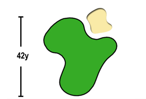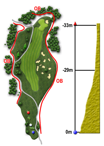 ティーショットは打ちおろし。右側のバンカー群をさけて、フェアウェイ左側ねらい。グリーン右サイドから奥にかけてOBがせまっているので、グリーンオーバーに注意。グリーン中央部左側アンジュレーションに注意。