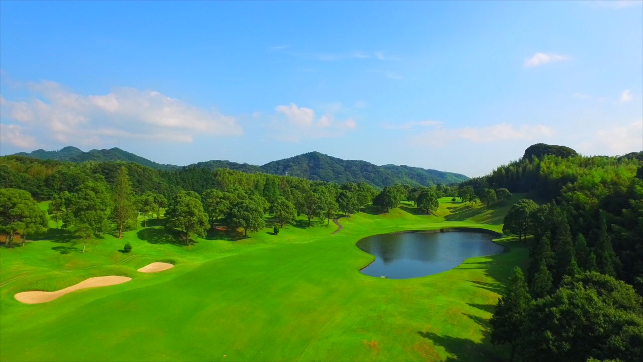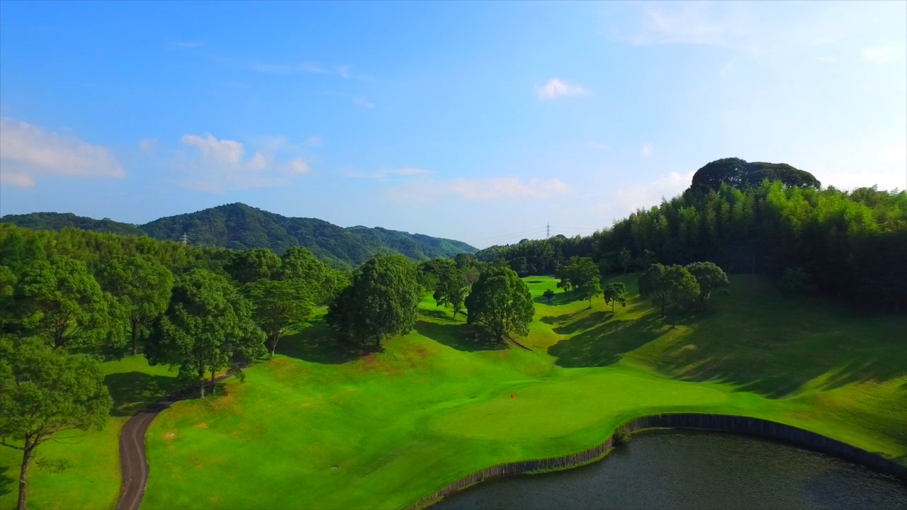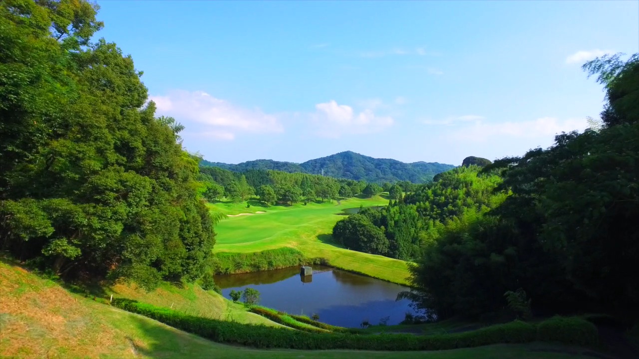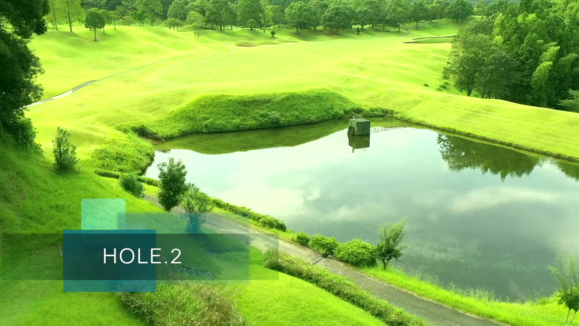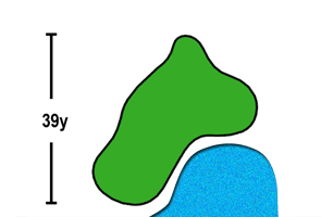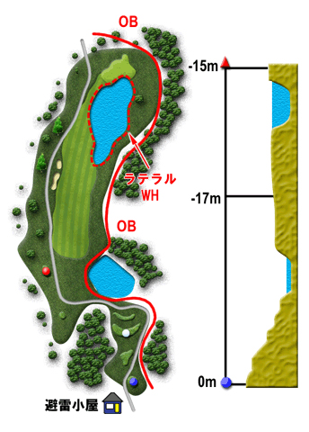 池越えの豪快な打ちおろし。池は150ヤードキャリーボールで越える。ティーショットは左前方のバンカー狙い。グリーン手前の大きな池をさけて、第2打はワンクラブ大きめのクラブでグリーン左半分狙い。