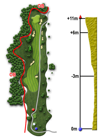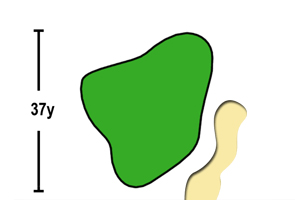 フェアウェイが狭く、右側には大小のマウンドが続いている。グリーンは砲台なので、第3打の距離感を慎重に。グリーン右サイドの深い大きなバンカーには要注意。